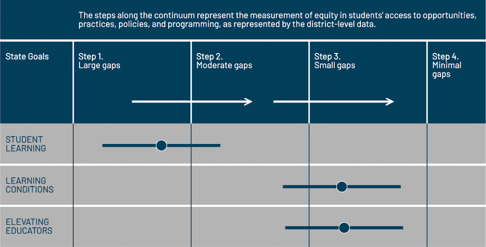 The steps along the continuum represent the measurement of equity in students' access to opportunities, practices policies, and programming, as represented by the district-level.